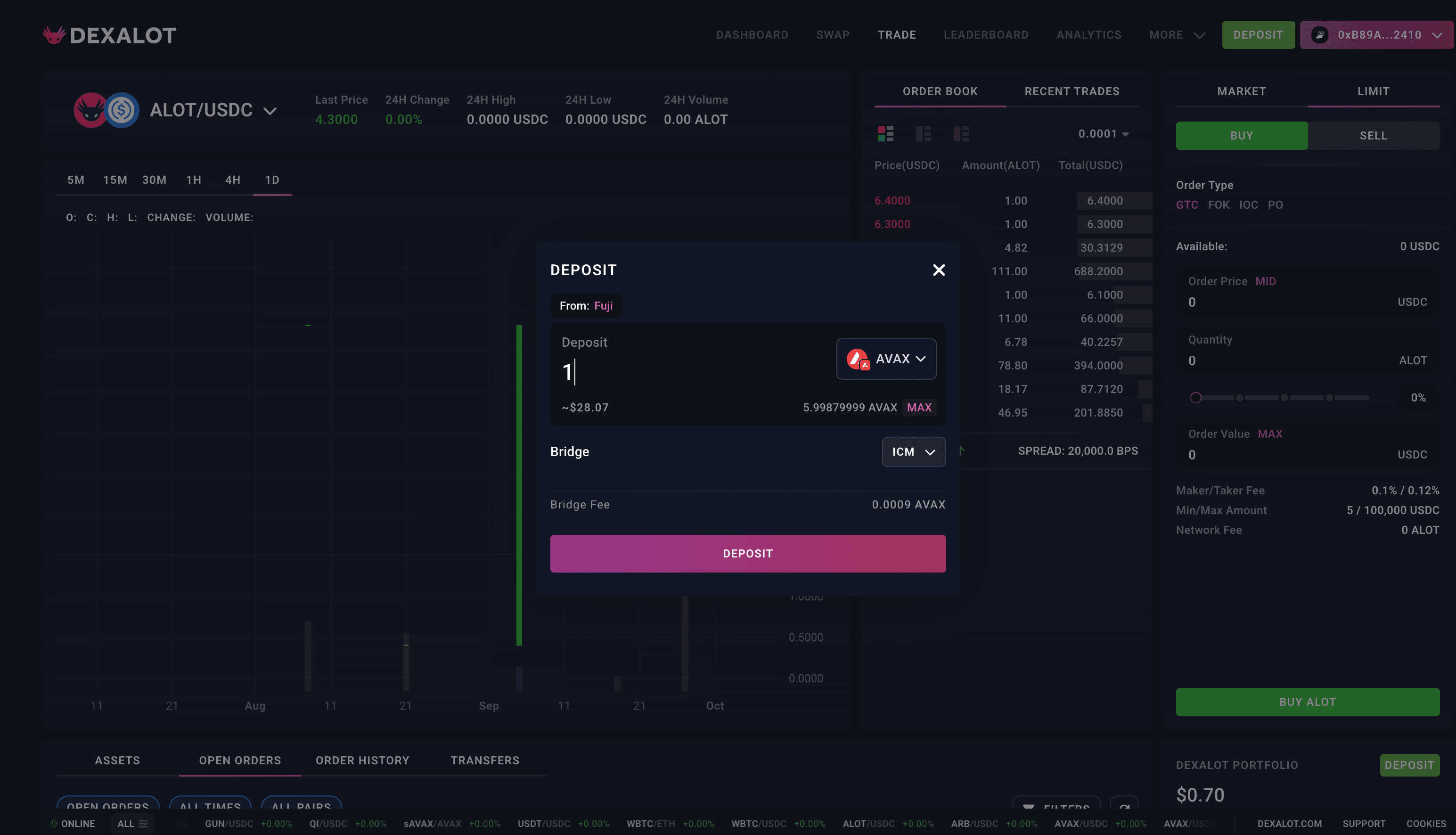 Head over to the Dexalot Testnet, connect your wallet (top right), and click on the Deposit button next to the pink icon with your connected wallet. You will have to authenticate your wallet for the first time you interact with Dexalot.
