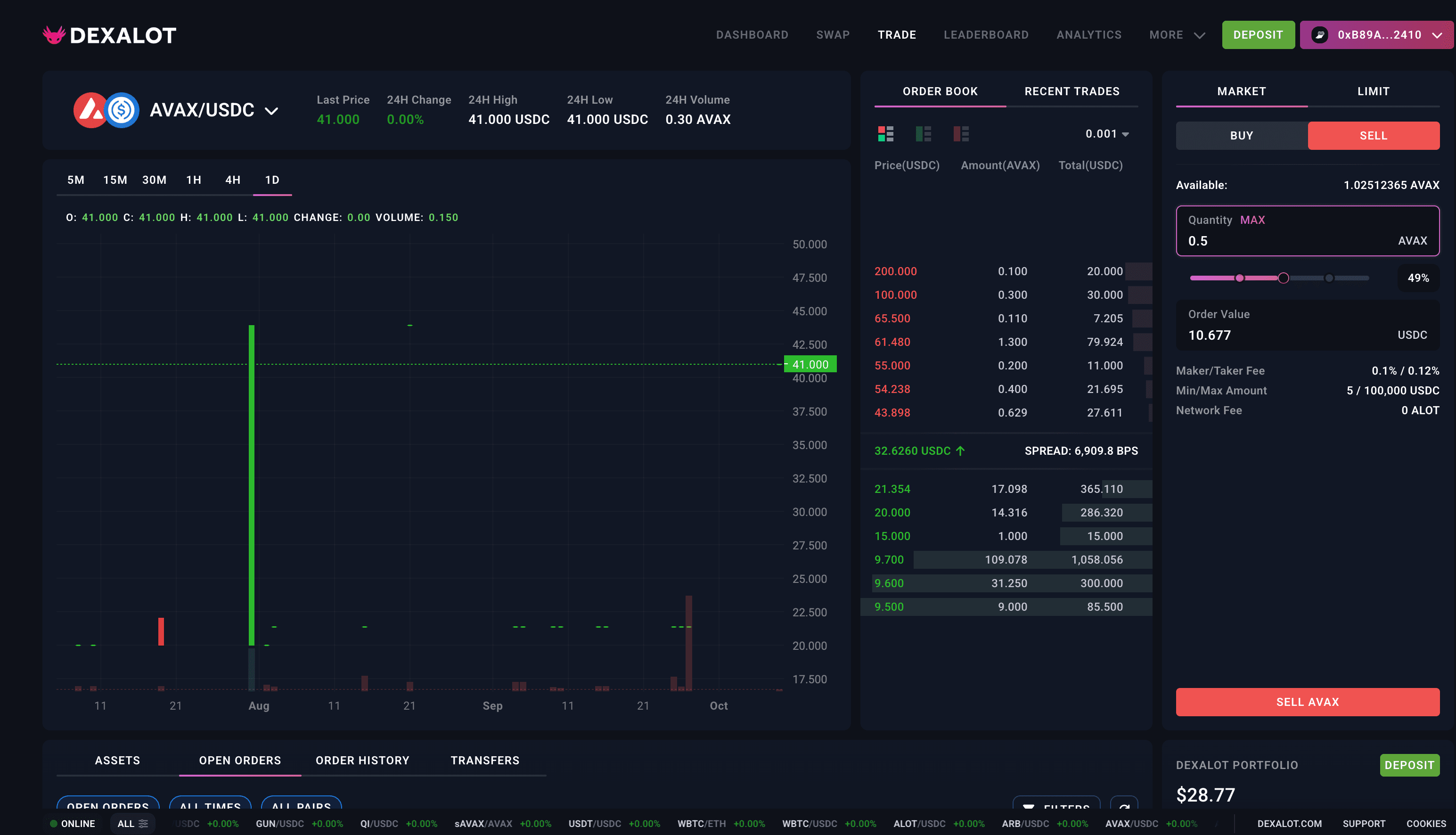 Now head to the Trade tab and sell 0.5 AVAX for USDC. You can select the trading pair AVAX/USDC on the top right. The website will prompt your wallet to switch networks to the Dexalot L1. Confirm the switch and then sign the transaction.