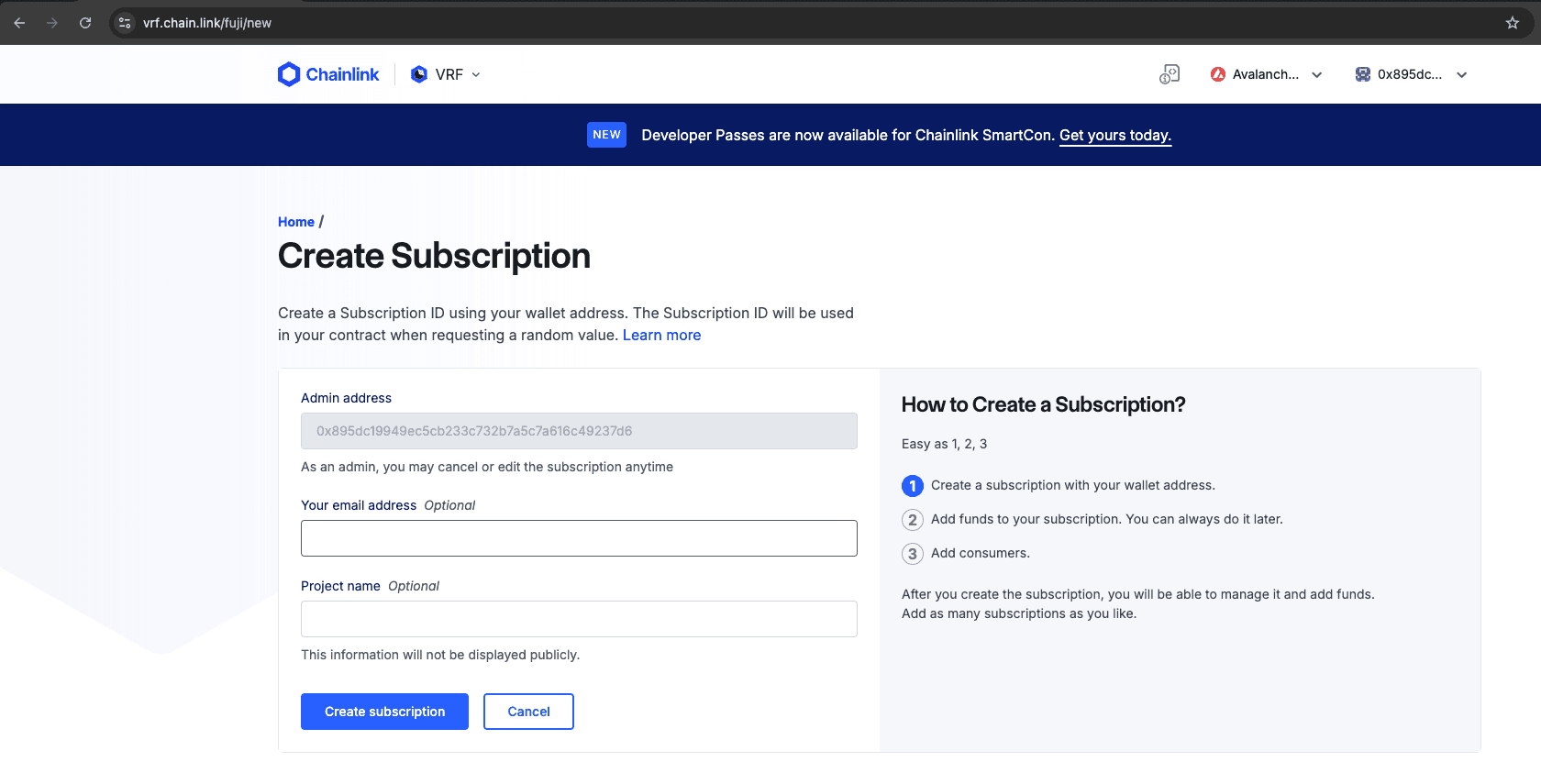 To create a subscription, go to the Chainlink VRF Subscription Manager on the network where you plan to request VRF (e.g., Avalanche Fuji). You can access the manager here: VRF | Subscription Management for Fuji.
